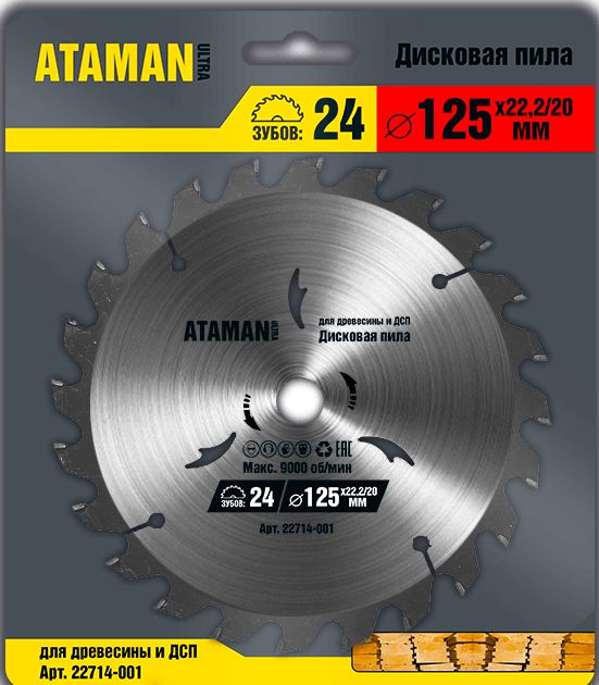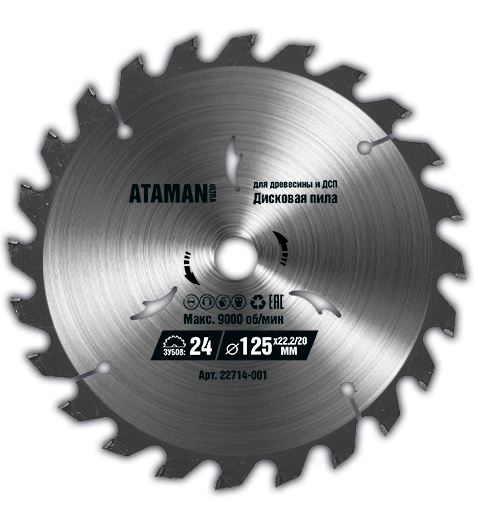 Пильный диск ATAMAN 24Т O125 22,2 мм – применяется при работе с ручными циркулярными пилами, стационарными пильными машинами, многопилами и подходят для профессионального использования на пилорамах. Используется для черновой обработки изделий из дерева, ламината, древесных плит, алюминиевых профилей, газобетона, полипропилена