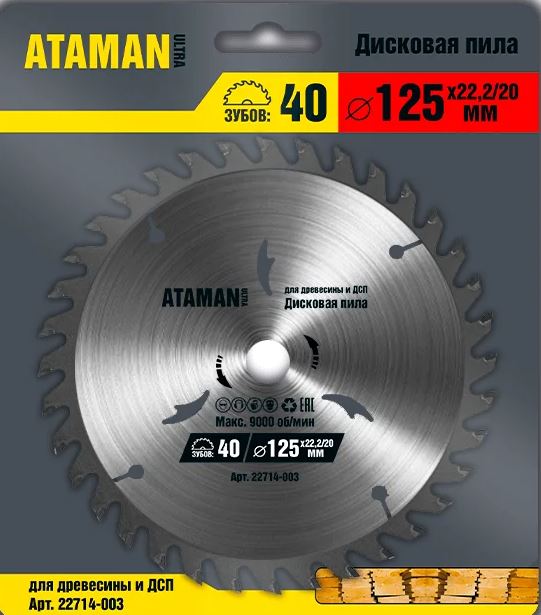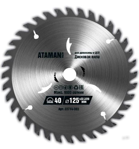 Пильный диск ATAMAN 40Т O125 22,2 мм – применяется при работе с ручными циркулярными пилами, стационарными пильными машинами, многопилами и подходят для профессионального использования на пилорамах. Используется для черновой обработки изделий из дерева, ламината, древесных плит, алюминиевых профилей, газобетона, полипропилена