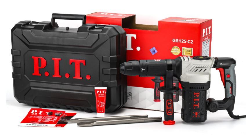 Молоток отбойный, пластиковый кейс, рукоятка дополнительная, ключ, смазка для редуктора, зубило плоское, зубило пикообразное, руководство по эксплуатации