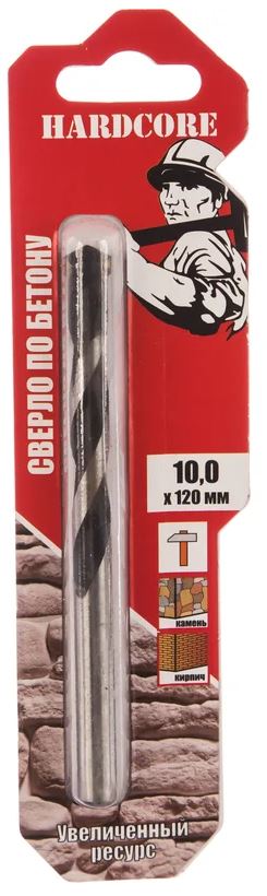 Сверло по бетону (10x120 мм) Hardcore 130010 оснащено твердосплавными напайками высокой твердости и прочности. Оснастка прошла термическую закалку, что обеспечивает высокую твердость сверла и позволяет сохранять прямую геометрию в работе. Имеет достаточно глубокую Н-образную канавку для облегчённого вывода пыли.
